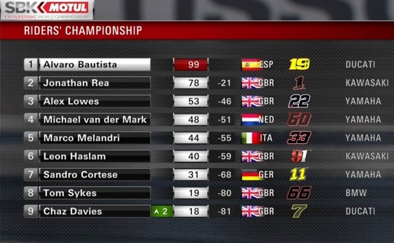 Bautista creusait un écart de 0.4 sur Rea, avec Lowes à 0.8, Haslam à 1.8, puis van der Mark et Melandri à 2.3. Rea restait au contact du leader espagnol, mais par contre Lowes passait à 1.1 et Haslam à 2.6 devant Melandri à 3.0.