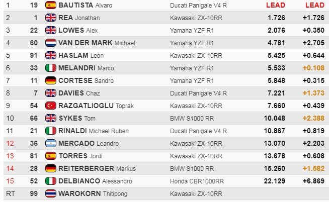 1.7 derrière Bautista, Lowes se rapprochait de Rea à 0.4, quand soudain le drapeau rouge était présenté. Il y avait eu une chute dans le virage 3 sans gravité pour Leon Camier (genou), Warokorn (trauma cranien) et la course était déclarée terminée.