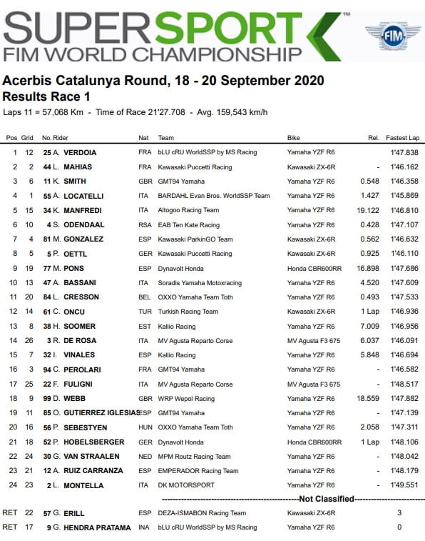 Le Champion WorldSSP300 de 2019, Gonzalez, terminait septième suivi de Öttl et Pons. Bassani clôturait le Top 10 tandis que Cresson empochait les points de la 11e place devant Öncü et Soomer, 13e. Parti depuis la pitlane, De Rosa concluait la course au 14e rang devant Viñales et Perolari se voyait classé 16e.