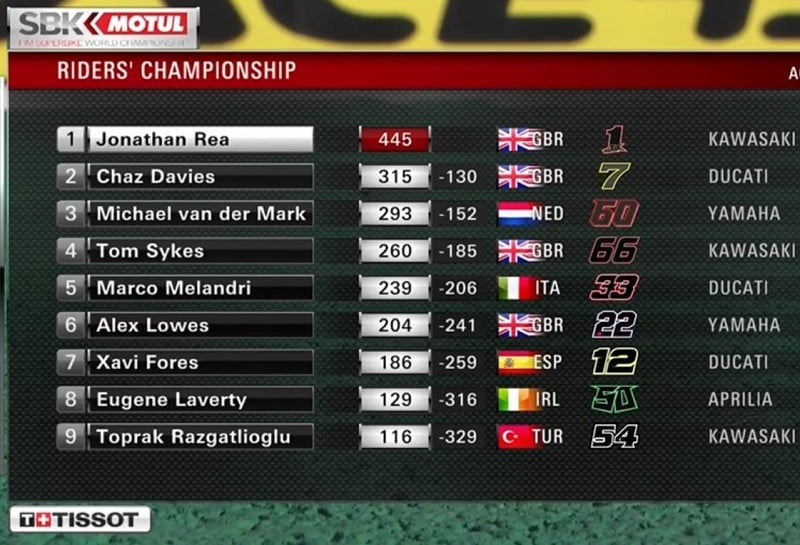 A la mi-course, Rea possédait 1.7 d’avance sur son coéquipier Sykes. Fores était troisième à 5.1 avec Savadori dans sa roue. Davis se rapprochait à moins d’une seconde de ces deux hommes.