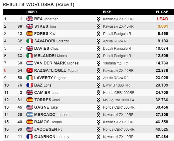 En fin de course, Rea assurait la victoire devant Sykes, tandis qu’une lutte très serrée pour la troisième position permettait à Fores de monter sur la troisième marche du podium devant Savadori et Davies. Loris Baz terminait 10e et Jérémy Guarnoni 17e.