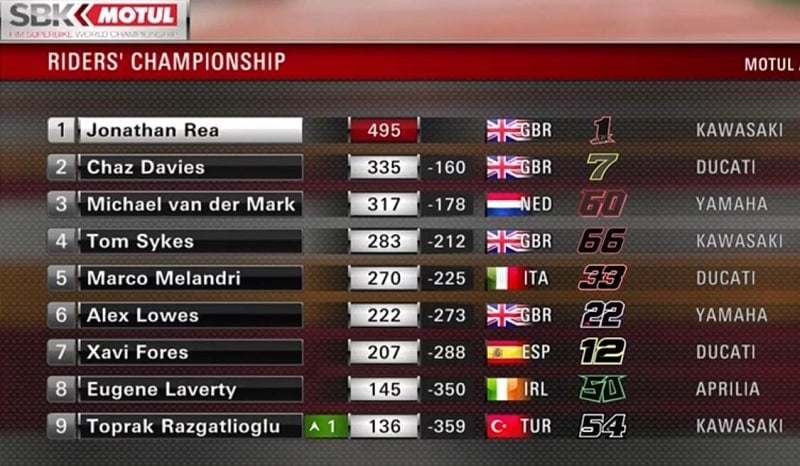 Rea augmentait son avance à 5.3 sur Melandri, et à plus de 10 secondes sur le groupe Razgatlioglu, Laverty, Sykes désormais rejoint par Xavi Fores. Baz était dixième et Marino onzième.