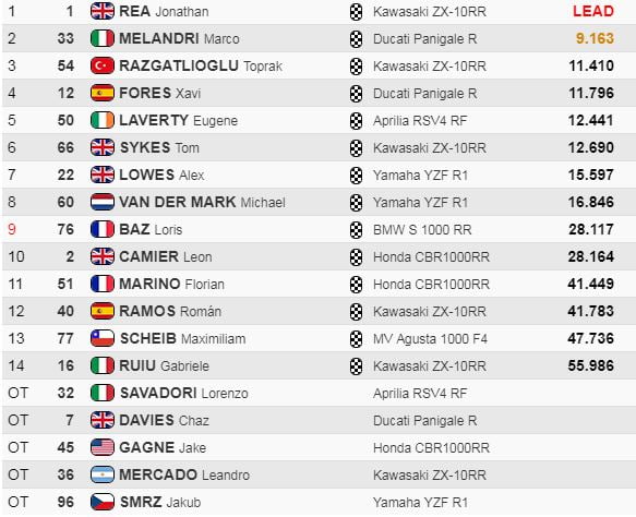 Pour Rea et Melandri, les positions se stabilisaient, tandis que Laverty ravissait la troisième position à Sykes. La lutte pour la quatrième place, à 5.8 du leader, opposait Razgatlioglu, Davies, Lowes, Fores et Savadori. Jake Gagne chutait sans gravité avec une des deux Honda Ten Kate. Marino 13e était donc deuxième Honda juste derrière l’autre 1000 CBR de Leon Camier, qui était précédée de Loris Baz.
