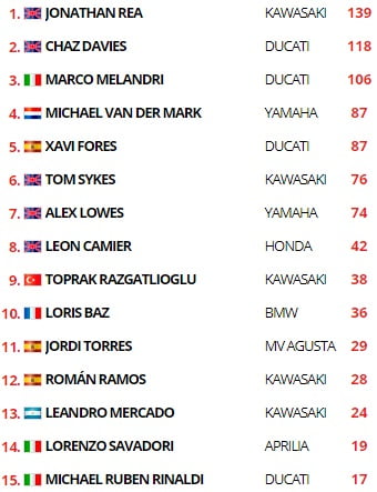 Johnny Rea distançait van der Mark de 0.4, devant Lowes, Fores, Davies, Melandri et Sykes.