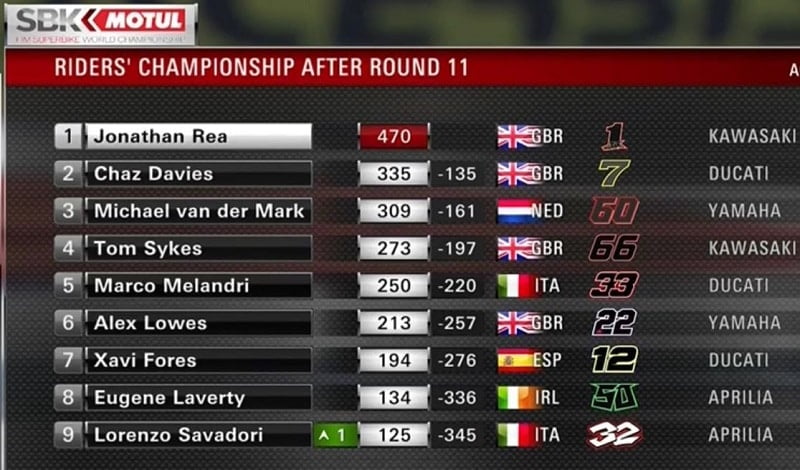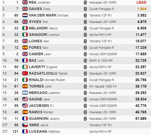 Les écarts se stabilisaient en fin de course et Rea l’emportait devant Davies, van der Mark, Sykes, Melandri, Savadori et Lowes. Loris Baz terminait dixième et Jérémy Guarnoni dix-neuvième. Les trois premiers du classement provisoire du Championnat étaient sur le podium.