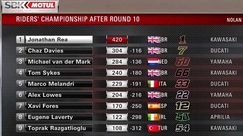 Rea reprenait l’avantage devant les deux Ducati, désormais serrées de près par la Yamaha. Puis van der Mark passait deuxième derrière Rea, et devant Melandri et Davies. Toprak Razgatlioglu chutait sans gravité.