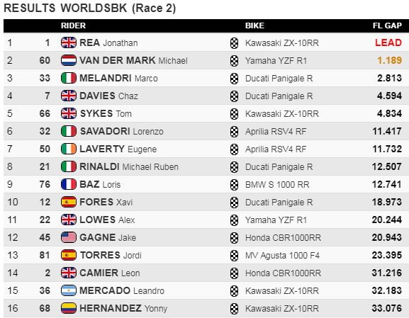 Michael van der Mark et sa Yamaha résistaient du mieux qu’ils pouvaient, mais ne pouvaient empêcher Johnny Rea de remporter sa 66e victoire en Championnat du Monde Superbike. Marco Melandri et Chaz Davies complétaient le quatuor de tête, tandis que Tom Sykes terminait cinquième et Loris Baz neuvième.