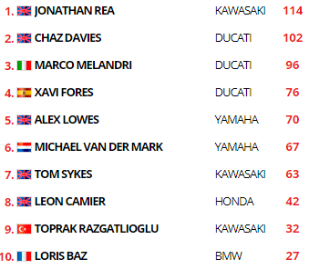 Rea se retrouvait donc leader à 10 tours du drapeau à damier, 0.2 devant Melandri, 0.3 devant Chaz Davies, alors que Michael Ruben Rinaldi occupait une belle quatrième position pour le tem Junior Ducati. Il précédait les deux Yamaha de Lowes et van der Mark, ainsi que Tom Sykes. Baz était seizième.