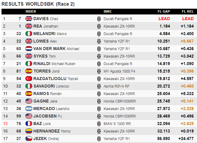 Sous le drapeau à damier, la victoire finale revenait magnifiquement à Chaz Davies, devant Johnny Rea, Marco Melandri, ainsi que les deux Yamaha d’Alex Lowes et Michael van der Marck, devant Tom Sykes. Loris Baz terminait dans les points en quinzième position.