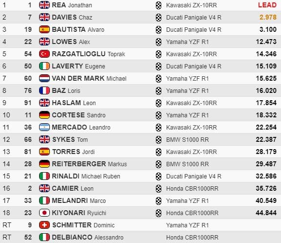 Rea passait de nouveau en tête devant Bautista et Davies. Van der Mark avait une grosse pression avec juste derrière lui Lowes, Haslam et Razgatlioglu. Loris Baz passait dixième devant Leandro « Tati » Mercado.