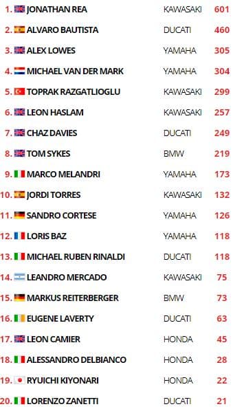 Alors que Jonathan Rea (Kawasaki Racing Team WorldSBK) a été sacré Champion du Monde dans la Nièvre et qu’Álvaro Bautista (Aruba.it Racing – Ducati) occupe solidement la deuxième place, c’est la troisième position finale du Championnat qui est l’objet d’une lutte serrée au Qatar entre Alex Lowes (Pata Yamaha WorldSBK Team) qui totalise 305 points, Michael van der Mark (Pata Yamaha WorldSBK Team) 304, et Toprak Razgatlioglu (Turkish Puccetti Racing) 299.