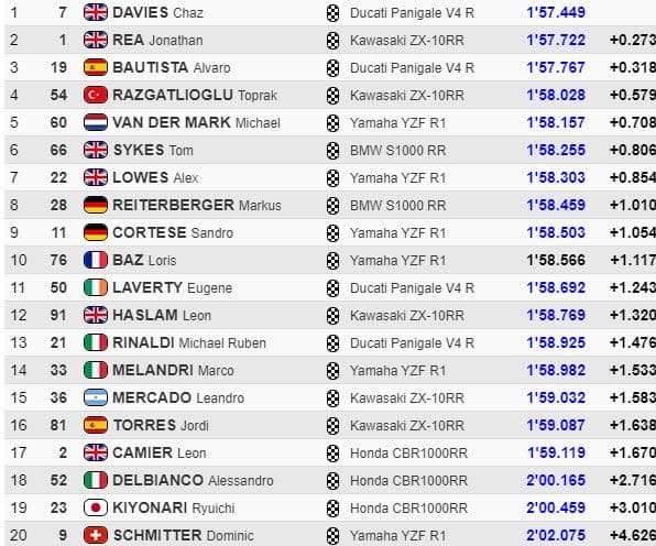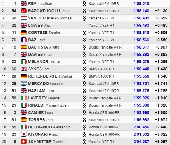 Le meilleur temps de cette première séance revenait à Rea en 1’58.010, qui devançait Razgatlioglu, van der Mark, Lowes (qui chutait dans son dernier tour, sans gravité), Cortese, Baz et Bautista.