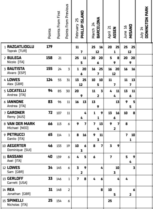 Nicolo Bulega (Aruba.it Racing – Ducati) le suit toutefois de près, à seulement 21 points, tandis que son coéquipier Alvaro Bautista occupe la troisième place et reste dans la course, avec 155 points, avec la volonté tenace de défendre son titre.