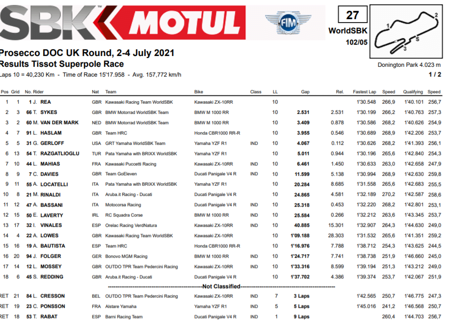 Le podium est compété par deux BMW de Van der Mark et de Sykes puisque Alex Lowes a chuté en entame d’épreuve. Razgatlioglu est sixième devant Mahias et derrière Gerloff qui n’a pas réussi à faire sauter le verrou Honda avec Haslam dessus de toute la course. Rea compté à présent 23 points d’avance sur Toprak à la Yamaha, et, aussi, 77 sur Redding qui lâche prise pour Ducati, dont le meilleur pilote dans cette manche aura été Davies, huitième.