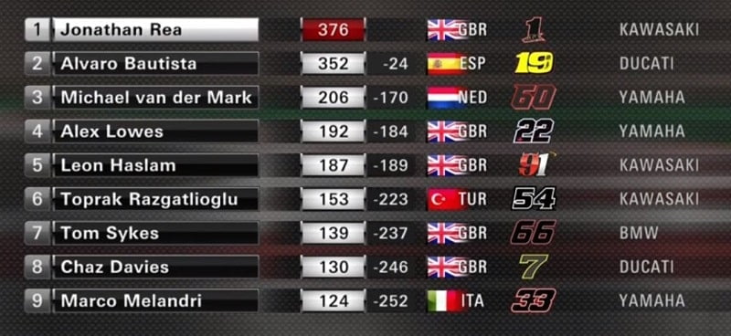 Johnny Rea appréciait la situation et sa nouvelle position de leader : « Je ne suis pas vieux, mais j’ai été dans cette position plusieurs fois auparavant, à penser au Championnat. C’est la première année que je suis en retard, habituellement, je suis toujours en tête. C’est une position agréable et je préfère cela, car j’ai quelque chose à poursuivre et c’est un vrai défi. Puis nous allons sur un autre de mes circuits préférés – Laguna Seca – et ensuite à Portimao à la fin de l’été. Ces courses seront très importantes pour la suite de la saison ! ».