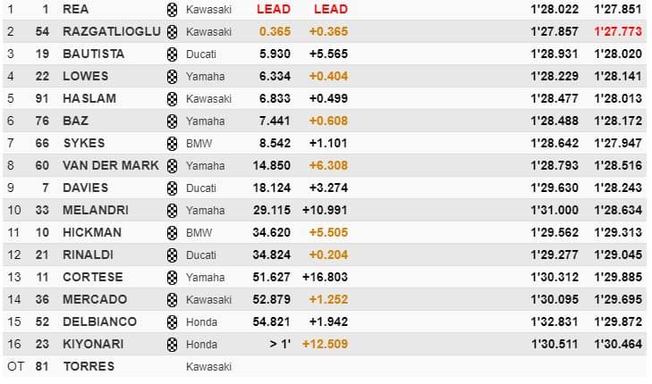 Le plus rapide lors de l’extinction des feux était Johnny Rea devant Toprak Razgatlioglu, Leon Haslam, Álvaro Bautista, Chaz Davies et les trois Yamaha de van der Mark, Lowes et Baz.