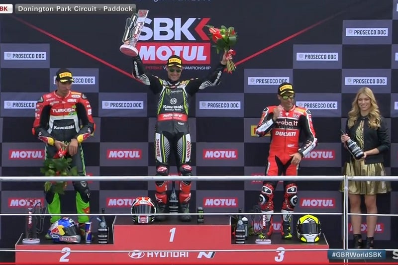 Nouveau venu chez BMW cette année, Tom Sykes a remporté à Donington 9 de ses 34 victoires en WorldSBK, toutes consécutives. Ce fut chaud en 2014 quand après s’être élancé de la 7e place, après un premier tour difficile, Sykes pointait à la 11e place sur sa Kawasaki ZX-10R. Au septième tour, il n’était qu’à la neuvième place, à 4.676 secondes de la tête. Une boucle plus tard, il avait dépassé Davies, Haslam et Rea avant de mettre Guintoli et Melandri derrière lui, cinq tours plus tard. Giugliano tombait quelques minutes après, et la Suzuki de Lowes ne résistait pas à l’attaque de Sykes. Il ne restait alors qu’un homme devant lui, Loris Baz, son coéquipier au sein du Kawasaki Racing Team, et sept tours à parcourir. Il en fallut trois au Britannique pour prendre la tête : le roi de Donington était de retour sur la plus haute marche du podium.