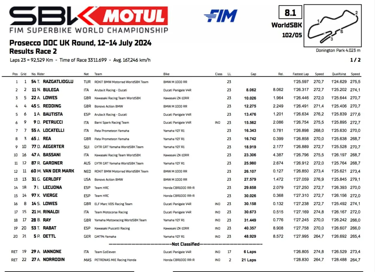 Il n’y a pas eu d’histoire en Superbike : Toprak Razgatlioglu remporte la dernière manche à Donington, cerise sur le gâteau d’un nouveau week-end de dictateur. Trois victoires sur trois, comme à Misano, voire plus. Car dans les montées et les descentes britanniques, la domination technique du pilote et de la moto a semblé bien plus écrasante que ce qui avait été apprécié sur la piste d’essai de Ducati. Cela fait sept courses gagnées d’affilée, en ajoutant la course 2 à Assen à la liste. Dans la matinée, Toprak avait mis sous sa coupe la course Sprint, accordant à Nicolò Bulega lui-même un espoir d’un tour et demi. Le championnat du monde franchira la moitié de son parcours la semaine prochaine à Most (République tchèque), mais pour l’instant, on ne voit pas qui et quoi pourrait briser cette série sans appel. Le dominateur turc a quelque peu refroidi l’enthousiasme qui avait animé le début du championnat. Qu’un géant comme BMW gagne fait le jeu du « système », mais le spectacle, le défi technique et la rivalité entre pilotes se sont évaporés.