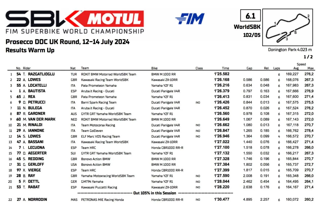 Rien de nouveau sous les nuages ​​britanniques pour le warm up du cinquième acte du Championnat du Monde WorldSBK Superbike à Donington : Toprak Razgatlioglu et la BMW sont très rapides même avec la gomme SCQ. Le triplé est en ligne de mire…