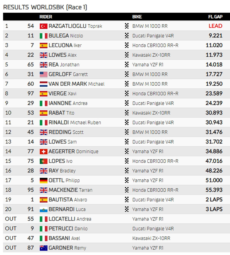 El Turco Toprak Razgatlioglu est véritablement de retour : la 16ème victoire de la saison, lors de la course 1, est une nouvelle étape vers le Championnat du Monde Superbike pour BMW. Nicolò Bulega récupère et résiste.