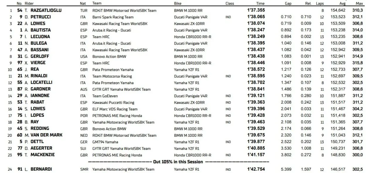 Le pilote turc a asséné une belle avance à ses adversaires, dont témoignent les 7 dixièmes sur Danilo Petrucci (Barni Spark Racing Team Ducati) et Alex Lowes (Kawasaki Racing Team), qui complètent dans cet ordre un top-3 photocopié de la FP1. Alvaro Bautista (Aruba.it Racing Ducati) a terminé quatrième, devançant Iker Lecuona de seulement 2 millièmes, cinquième, confirmant l’excellente forme de l’équipe Honda HRC malgré la chute sans gravité au virage 3 de son coéquipier Xavi Vierge (9ème). Le duo ibérique a précédé une autre paire de compatriotes composée de Nicolò Bulega, déjà mentionné, et d’un bon Axel Bassani, septième sur la deuxième Kawasaki KRT.