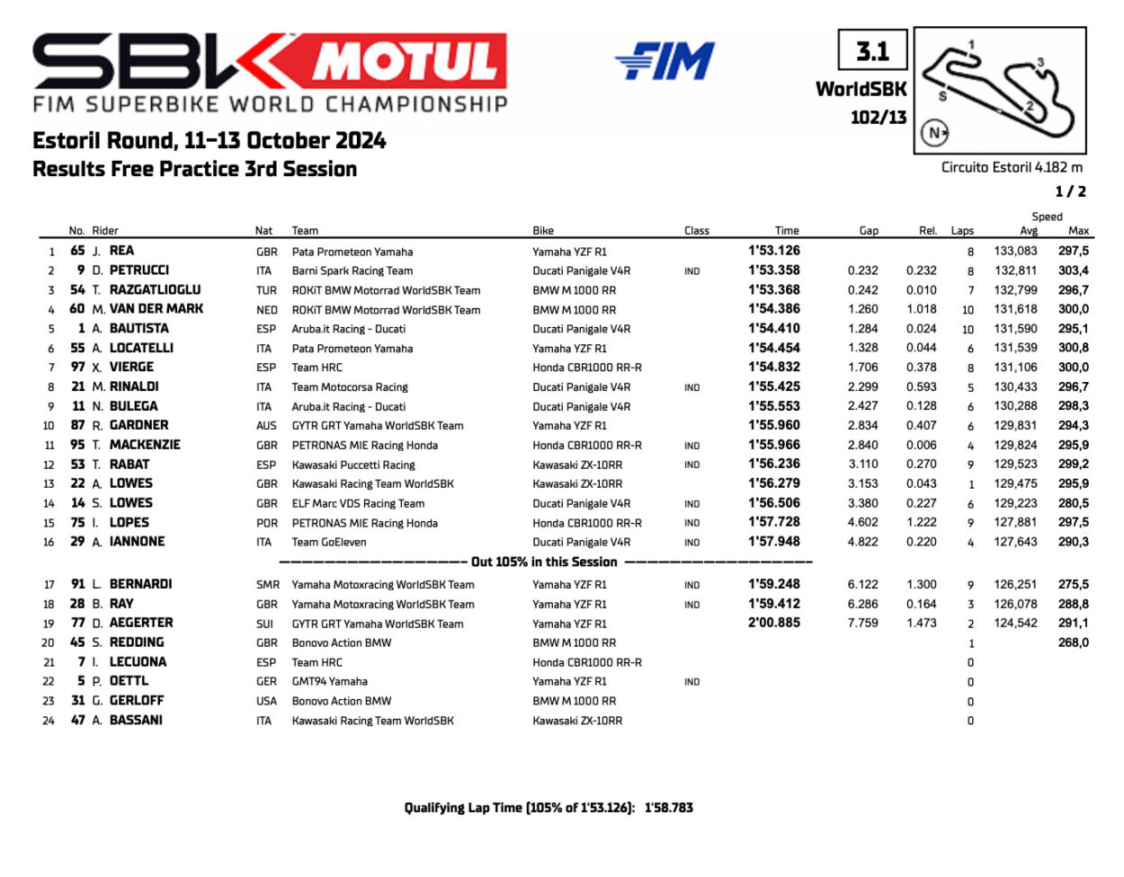 Résultats de la FP3 des Superbike à Estoril :
