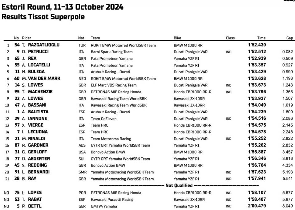 Résultats de la Superpole des Superbike à Estoril :