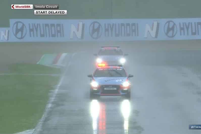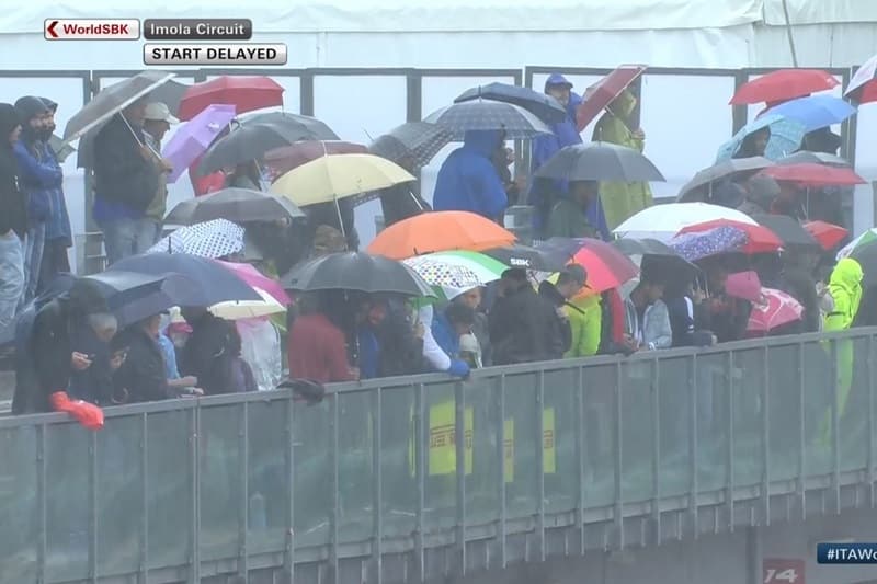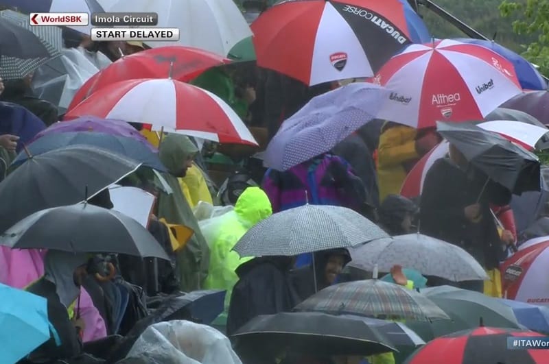 Le départ était retardé de plus d’une heure. Plusieurs voulaient rouler car certains de marquer de gros points, comme Johnny Rea. D’autres étaient moins enthousiasmes, pour la raison inverse, comme Álvaro Bautista. Enfin certains, loin derrière sur le sec, souhaitaient ardemment rouler sur le mouillé car c’était leur seul chance de faire un bon résultat, comme Sandro Cortese. La majorité ne souhaitait pas rouler.