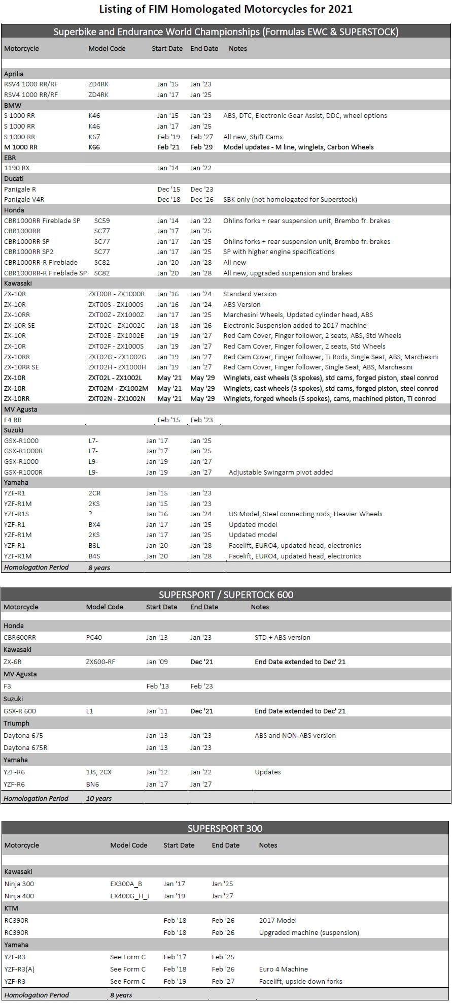 La FIM a publié ce matin la liste de toutes les motos homologuées cette année pour les championnats du monde Superbike, Supersport, Supersport 300 et Endurance.