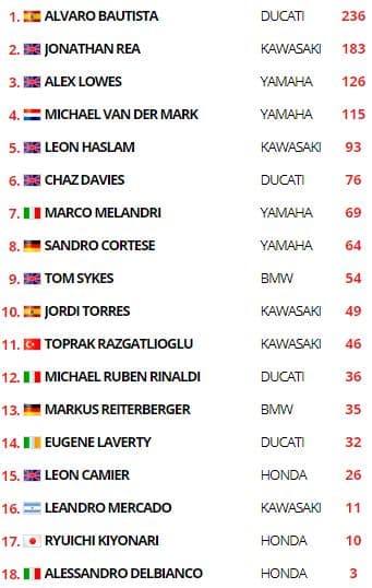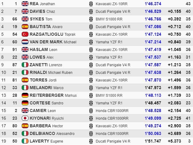 Rea bouclait la première séance en tête en 1’46.636, avec 0.288 d’avance sur Davies, 0.6 sur Bautista, 0.7 sur Haslam et 0.9 sur Sykes et van der Mark.