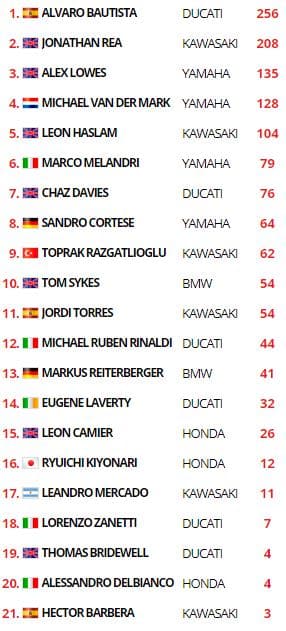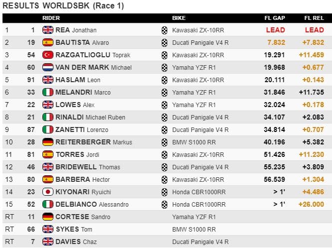 A 16 tours de la fin ‘sur un total de 19), Rea précédait Bautista de 1.7, tout en établissant le meilleur temps en course en 1’46.023. Sykes était à 5 secondes, non directement menacé par le groupe à la lutte pour la quatrième position et composé de Lowes, van der Mark, Haslam et Razgatlioglu.