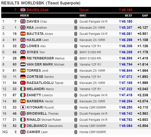 Bautista prenait d’office l’avantage en 1’46.328, battu peu après par Rea en 1’45.754. Dans les toutes dernières minutes, Rea passait en 1’45.307, puis Chaz Davies plaçait sa Panigale V4 R en tête en 1’45.180 devant ses compatriotes Johnny Rea et Leon Haslam, précédant Alvaro Bautista. L’espagnol doublait Haslam pour s’emparer de la troisième place.