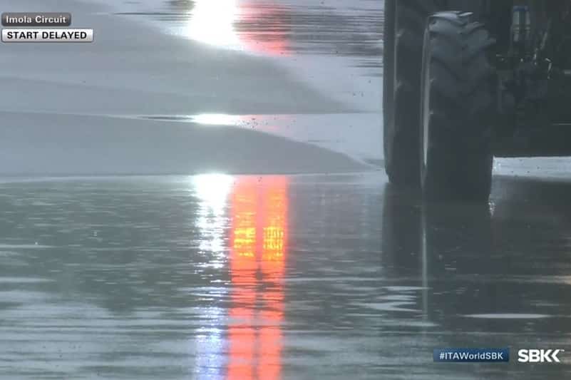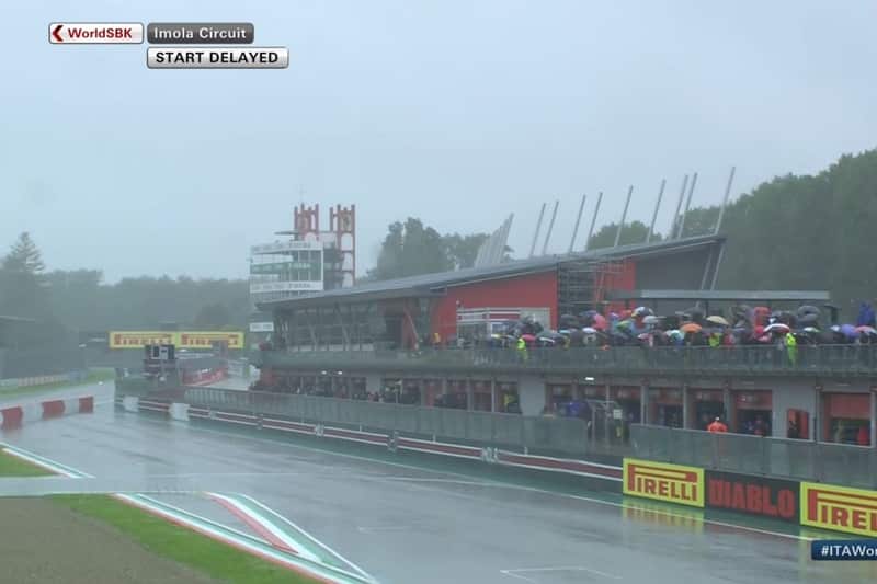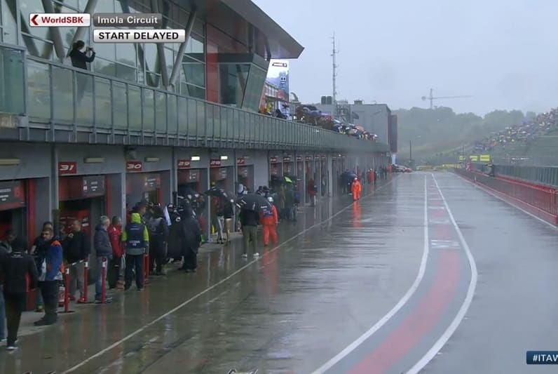 Le départ était retardé de plus d’une heure. Plusieurs voulaient rouler car certains de marquer de gros points, comme Johnny Rea. D’autres étaient moins enthousiasmes, pour la raison inverse, comme Álvaro Bautista. Enfin certains, loin derrière sur le sec, souhaitaient ardemment rouler sur le mouillé car c’était leur seul chance de faire un bon résultat, comme Sandro Cortese. La majorité ne souhaitait pas rouler. Alors que le nouveau départ devait être donné à 15h15 (au lieu de 14h00), il était de nouveau retardé par la Direction de Course.