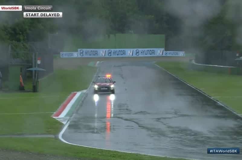 Ce dimanche, avant le départ de la troisième course, la température de l’air était de 14° et celle de la piste de 19°. L’ennui est qu’il pleuvait à torrent, ce qui est toujours une mauvaise chose à Imola en raison des flaques d’eau stagnante. On avait déjà annulé des courses sur ce circuit en raison de la pluie.