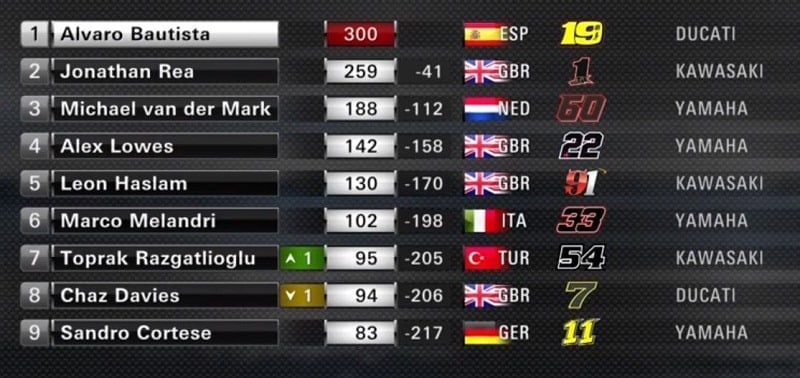 Rea réalisait un nouveau meilleur temps en course en 1’39.876. Loris Baz passait neuvième à 12 secondes du leader van der Mark. Michael Ruben Rinaldi défendait brillamment l’honneur de Ducati en ravissant la quatrième place à Leon Haslam. Ça faisait de précieux points pour Ducati au classement constructeurs, après l’abandon de ses deux pilotes officiels.