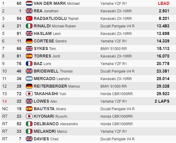 Michael van der Mark augmentait son avance à plus de deux secondes sur Johnny Rea dans les toutes dernières boucles, avec Razgatlioglu troisième à 7 secondes, et le groupe à la lutte pour la quatrième place à 12.7, comprenant Rinaldi, Haslam, Cortese, Sykes et Torres, quelques longueurs devant Loris Baz neuvième.