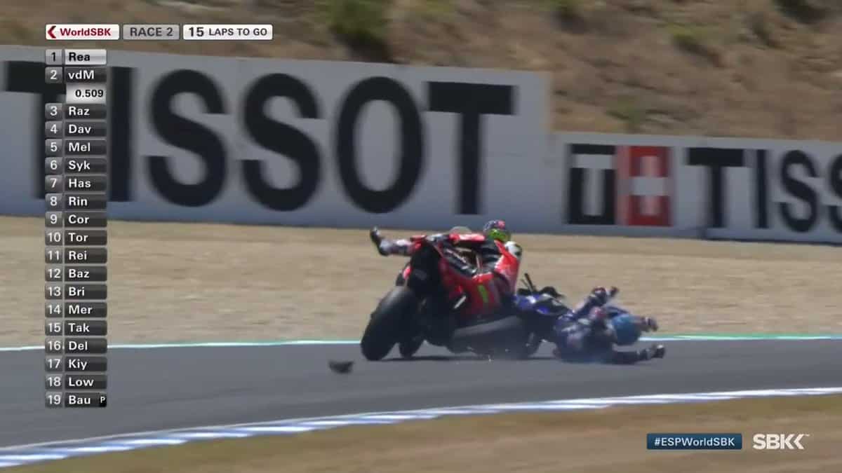 Si Alex Lowes a ensuite chuté deux fois lors des courses de ce meeting, on s’attardera sur la passe d’armes entre Chaz Davies et Marco Melandri. Les deux anciens équipiers chez Ducati ne s’apprécient guère et leur relation ne s’est pas arrangé à Jerez. La Yamaha de l’Italien a en effet percuté la Ducati du Gallois. Chacun s’est rejeté la responsabilité de l’accident.