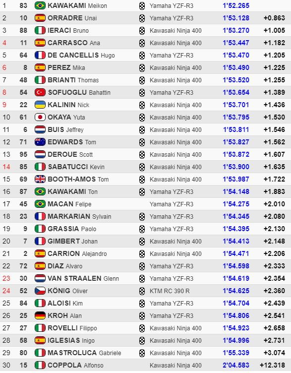 Dans les premières minutes, sur un total de vingt pour cette Superpole, Ana Carrasco sonnait la charge en 1’54.209. Le Brésilien Meikon Kawakami (Yamaha Team Brasil AD 78) lui succédait en haut des écrans de chronométrage en 1’52.265. Il précédait l’Australien Tom Edwards (Kawasaki ParkinGO Team).