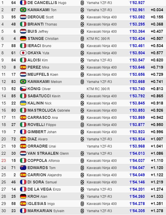 Lors de la journée déjà bien chaude du samedi, Meikon Kawakami (Yamaha Team Brasil AD 78) avait été le plus rapide de la Superpole, devant Unai Orradre (Yamaha MS Racing), Bruno Ieraci (Kawasaki GP Project), l’ex-Championne du Monde Ana Carrasco (Kawasaki Provec WorldSSP300), le Français Hugo de Cancellis (Yamaha Team Trasimeno), membre de la ZF Grand Prix School de Laurent Fellon, et Mika Perez (Kawasaki Prodina Ircos Team WorldSSP300).