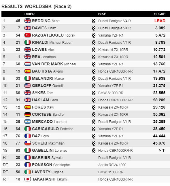 Au championnat, Scott Redding possède 98 points, devant Jonathan Rea 74, Alex Lowes 72, Toprak Razgatlioglu 66, Chaz Davies 57 et Michael van der Mark 47.