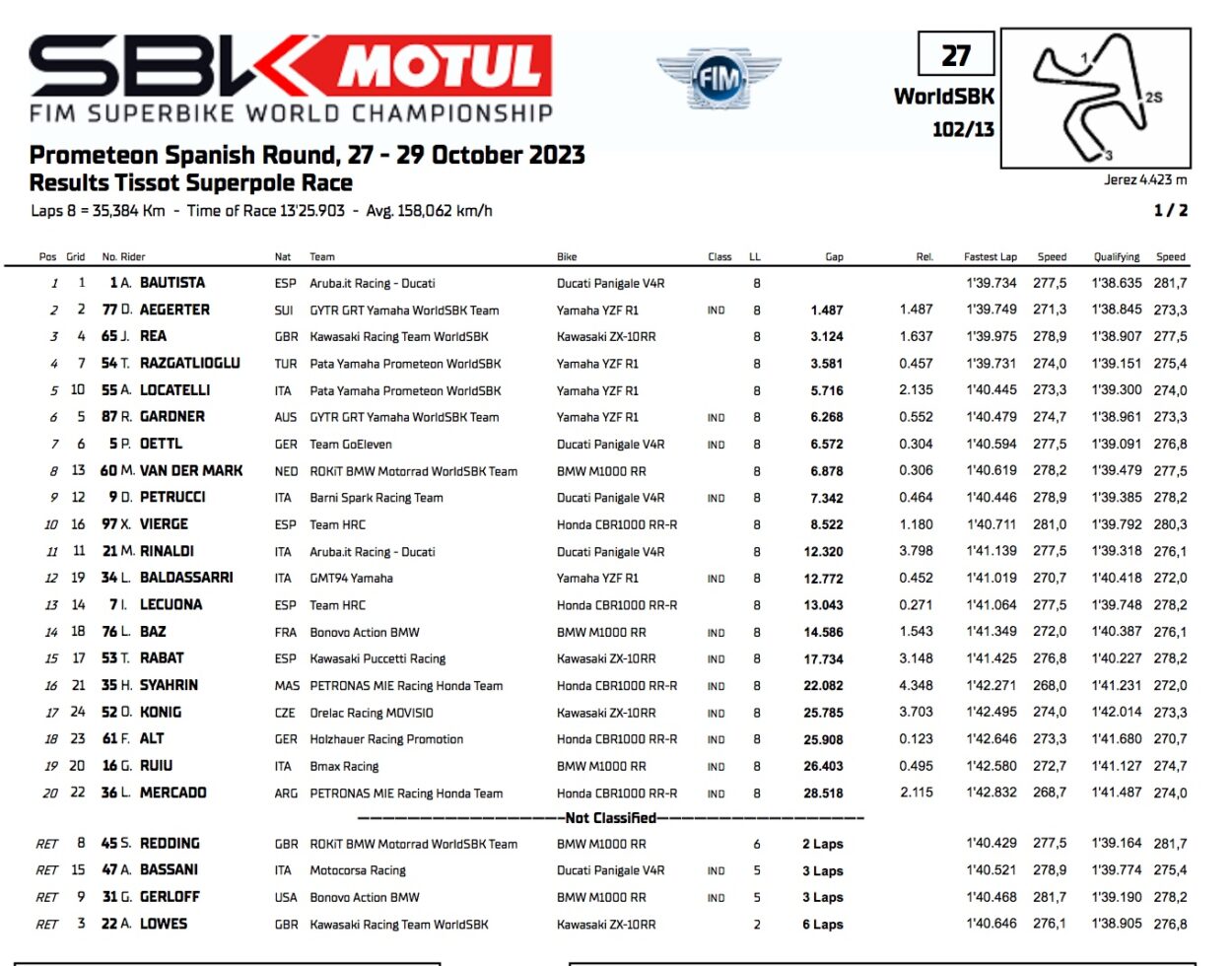 Alvarito a déjà fêté son deuxième titre en Superbike, mais la fête de Jerez ne l’a pas rassasié. Le pilote Ducati a également été implacable dans la Superpole Race, signant le 26e triomphe de cette année exceptionnelle, le 58e de sa carrière. S’il réussit à nouveau cet après-midi, il rejoindra Carl Fogarty, l’une des légendes des motos dérivées de la série. Bautista a également dominé sur la distance du sprint, réussissant à exploiter le Pirelli SCQ, le pneu super tendre des qualifications, qui a plutôt mis en crise Toprak Razgatlioglu, seulement quatrième. Est-ce dû à la légèreté de l’Espagnol ou à ses sensations de pilotage ?