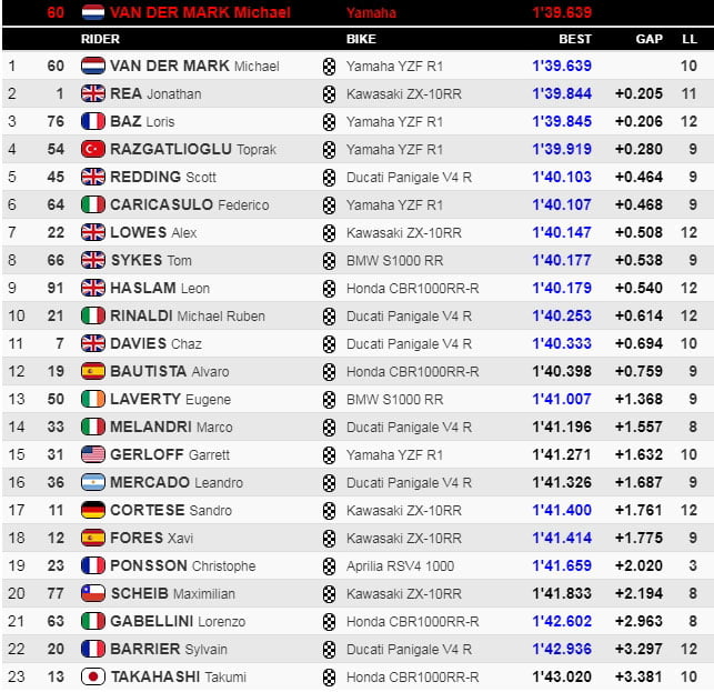 Ce trio de tête très serré précède d’au moins trois dixièmes à la mi-séance le leader du championnat Alex Lowes, Michael van der Mark, Michael Rinaldi, Tom Sykes, Scott Redding et Álvaro Bautista.