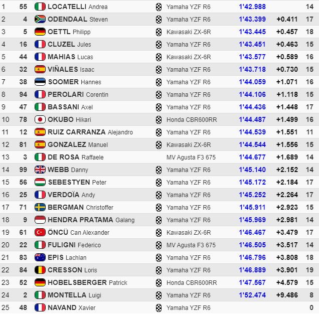 A mi-séance, la température de l’air était de 29° et celle de la piste de 39°. Les ZX-6R résistaient bien aux R6, avec Öttl deuxième et Mahias quatrième, contre Locatelli leader et Viñales troisième. C’était plus difficile pour MV Agusta avec de Rosa dixième et pour Honda avec Okubo douzième.