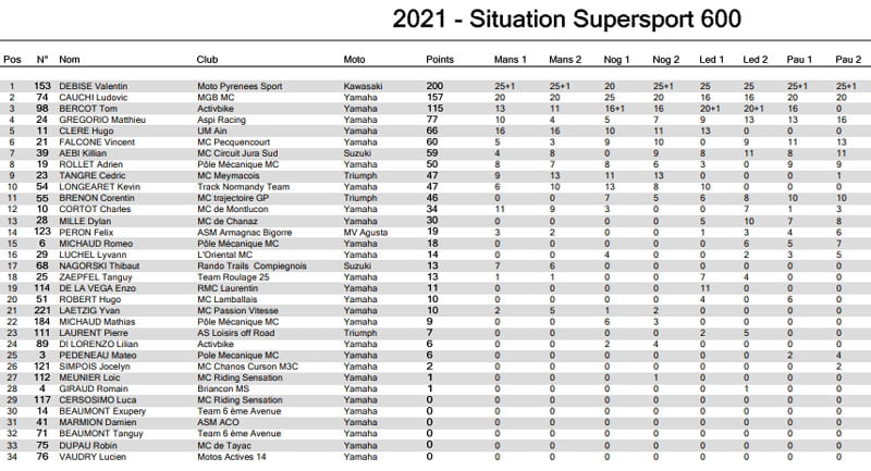 Avec 52 points à attribuer à Magny-Cours, la partie paraît donc difficile pour le jeune espoir français protégé d’Adrien Morillas, par ailleurs leader en catégorie Supersport 600 Challenger, mais en compétition rien n’est jamais écrit d’avance, et gageons que le stress sera autant présent sur la Kawasaki verte numéro 153 que sur la Yamaha noire numéro 74…