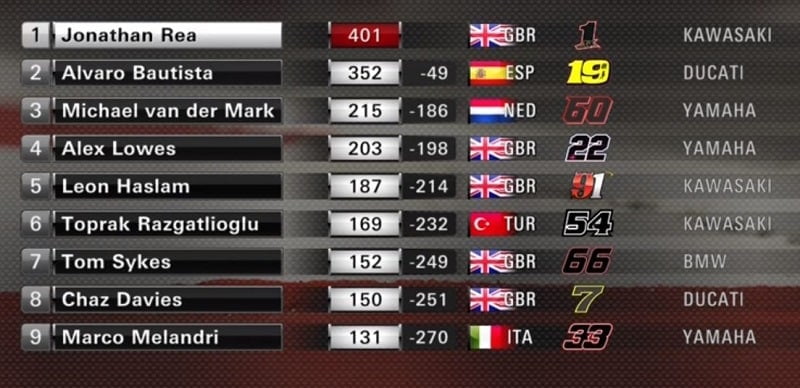 Rea dominait alors très largement le Championnat, mais un peu moins la course car Chaz Davies était collé à sa roue arrière. Toprak Razgatlioglu occupait une bonne troisième place à 2.8 devant Tom Sykes à 4.4 et Torres à 5.6. Baz était alors septième et Beach dixième. Bautista occupait la 18e position, seul Haslam ayant abandonné sur chute.