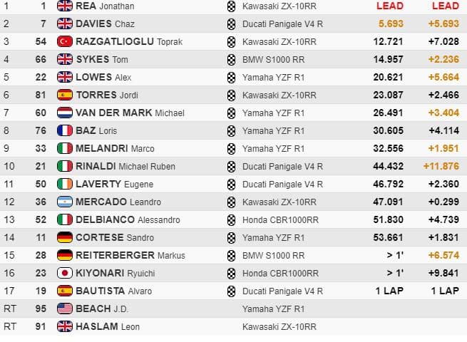 Rea était seul en tête, 2.3 devant Davies, 9.7 devant Razgatlioglu, 11.1 devant Sykes, et 14.6 devant Torres et Lowes. Loris Baz, en huitième position, suivait van der Mark sans être inquiété par Melandri.