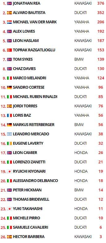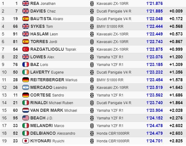 Rea partira donc de la pole position avec Davies et Bautista à ses côtés. Sur la deuxième ligne, Sykes s’élancera avec Haslam et Torres, puis Loris Baz de la troisième.