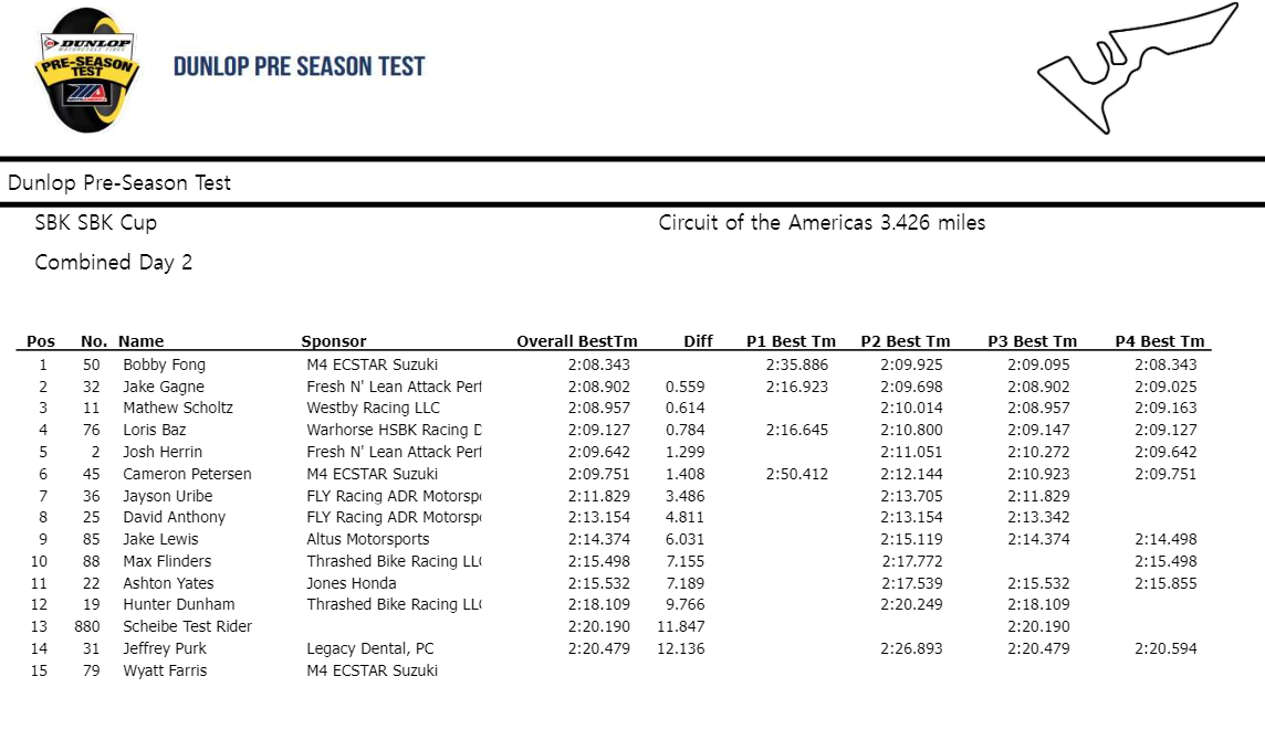Bobby Fong et sa Suzuki du team M4 Ecstar a finalement réalisé le meilleur chrono lors du test officiel de pré-saison MotoAmerica/Dunlop sur le Circuit of the Americas (COTA) à Austin. Sur sa GSX-R1000 avec un pneu arrière tendre, Bobby Fong a réalisé un tour en 2’08.343, le temps le plus rapide des deux jours d’essai, ce qui est aussi plus rapide que celui de Josh Herrin en 2019, qui a décroché le record du tour en course en 2’08.994.