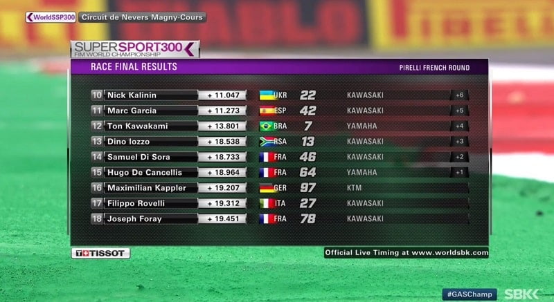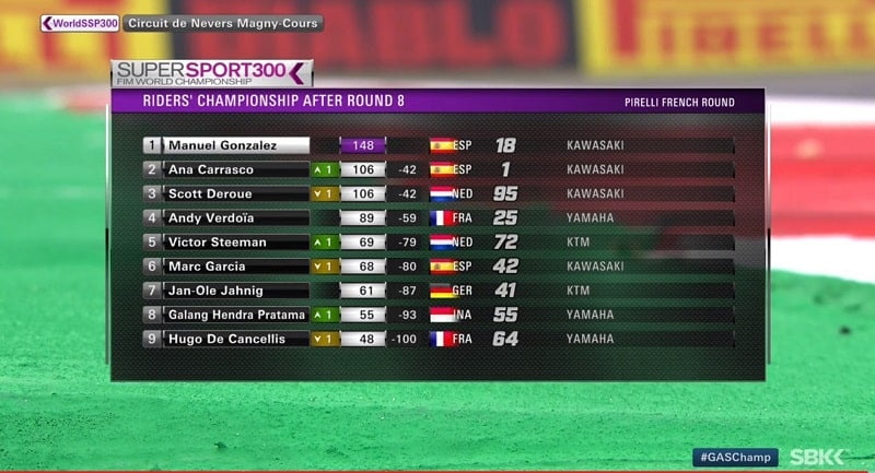 Après cette avant-dernière manche du Championnat disputée dans la Nièvre, il ne restera qu’une course au Qatar et l’Espagnol Manuel González (Kawasaki) pouvait être sacré à Magny-Cours s’il terminait dans les quatre premiers de la course de dimanche, ce qui était loin d’être évident dans la plus petite catégorie. Deux autres pilotes Kawasaki avaient encore un espoir de titre, le Néerlandais Scott Deroue, régulier et vainqueur de la dernière manche au Portugal, et la Championne du Monde en titre, l’Espagnole Ana Carrasco, qui avait besoin d’un concours de circonstance favorable pour remonter ses 47 points de retard sur Manuel González.