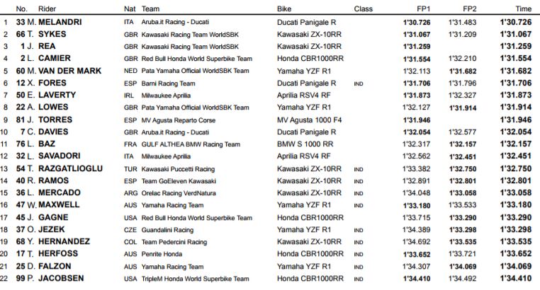Marco Melandri terminait la journée en première position sur sa Panigale, alors que son coéquipier Chaz Davies peinait un peu à la dixième place. Johnny Rea et son coéquipier Tom Sykes plaçaient leurs Kawasaki aux deuxième et troisième positions. Leon Camier réalisait un bon quatrième temps sur sa Honda, devant la Yamaha de Michael van der Mark et la Panigale de Xavi Fores. Loris Baz continuait d’améliorer les réglages de sa BMW Althea qu’il avait commencé à perfectionner lors des tests de Portimao. Il disposait de deux S 1000 RR mises à sa disposition par Genesio Bevilacqua.